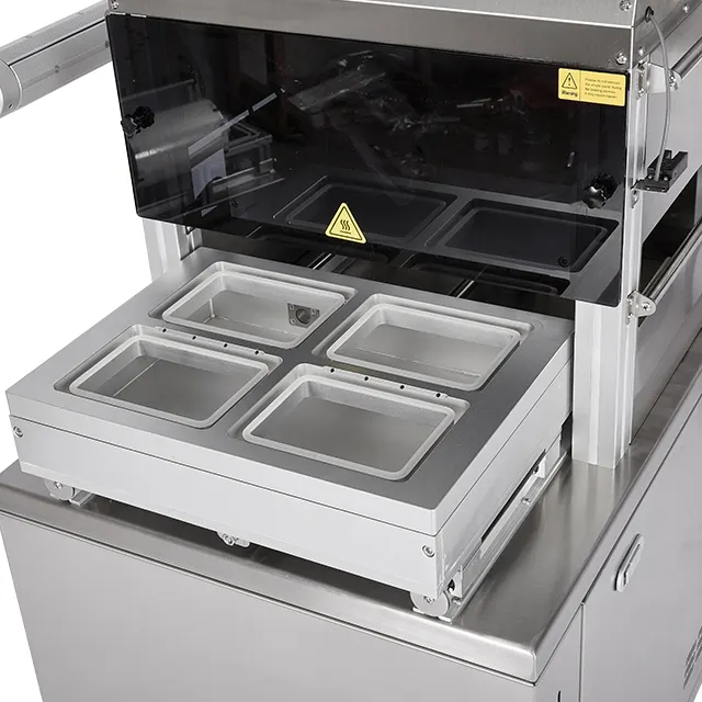 A heated sealing head fuses the packaging film to the tray’s edges, forming an airtight seal.